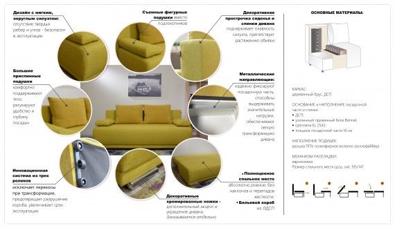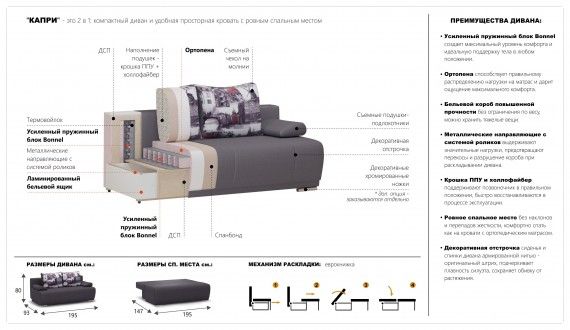 Молодежный диван "Капри" - это отличное решение для интерьера по разумной цене! Компактный размер и подушки вместо подлокотников отлично сэкономят пространство комнаты. Деревянный каркас изготовлен из бруса хвойных пород, что является экологичным и надежным материалом, обеспечивающим долгий срок службы модели и безопасность Вашего здоровья. Простой механизм трансформации "Еврокнижка" легок в использовании, а спальное место абсолютно ровное и без наклонов. Такой покупкой можно только наслаждаться.