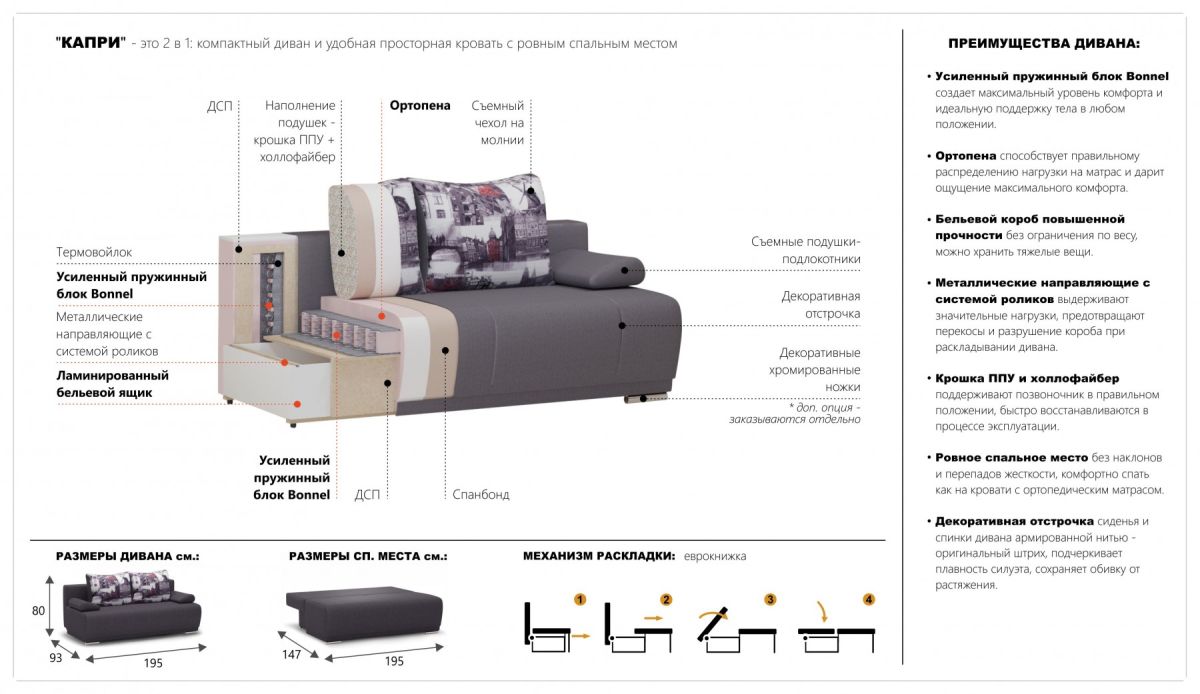 Молодежный диван "Капри" - это отличное решение для интерьера по разумной цене! Компактный размер и подушки вместо подлокотников отлично сэкономят пространство комнаты. Деревянный каркас изготовлен из бруса хвойных пород, что является экологичным и надежным материалом, обеспечивающим долгий срок службы модели и безопасность Вашего здоровья. Простой механизм трансформации "Еврокнижка" легок в использовании, а спальное место абсолютно ровное и без наклонов. Такой покупкой можно только наслаждаться.