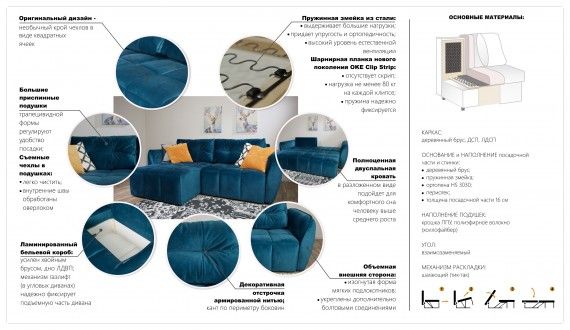 Мягкий диван повышенной комфортности, на котором приятно проводить время. Классический дизайн, округлые мягкие формы, утопающая посадка - все это делает его незаменимым для отдыха. Украшением дивана является декоративная прострочка и стяжки на спинке, подлокотниках и посадочном месте, которая благодаря своим свойствам повышает прочность и износоустойчивость обивки. Две большие подушки регулируют удобство посадки, после сидения моментально восстанавливают первоначальную форму. Механизм трансформации тик-так и мягкие элементы превращают диван в полноценную кровать. Большой бельевой короб для хранения вещей – приятное дополнение к дивану. Универсальный угол - переставляется на левую или правую сторону основной секции, удобно при частых перестановках.