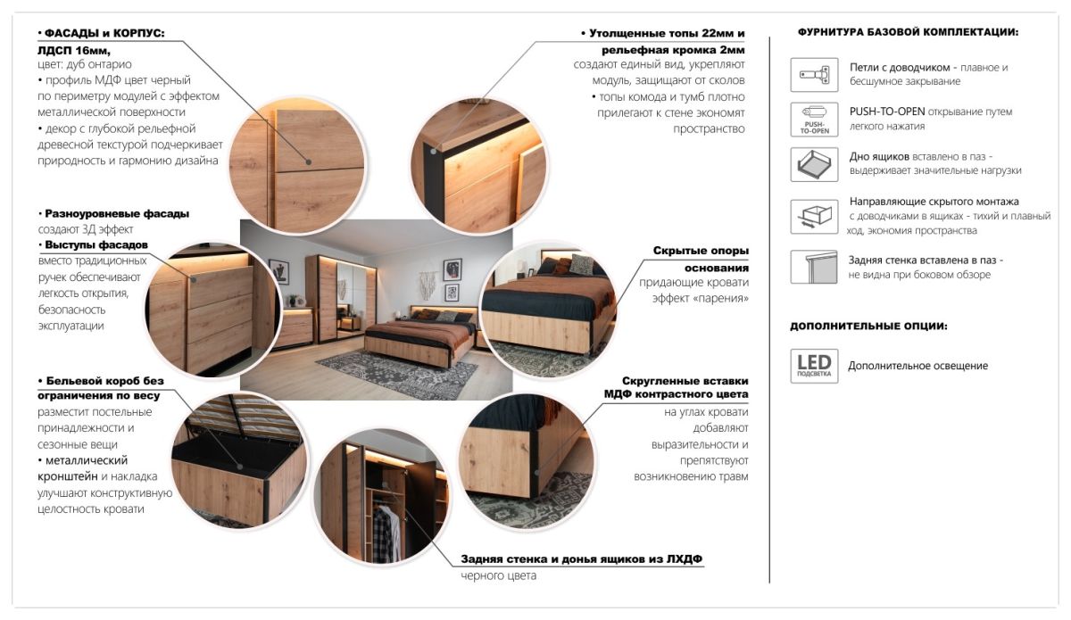 • ✅ Выразительная эстетика: Динамичные разноуровневые фасады, контрастное сочетание дуба Онтарио и черного, а также тонкое обрамление из МДФ под металл создают сложный, проработанный дизайн.
