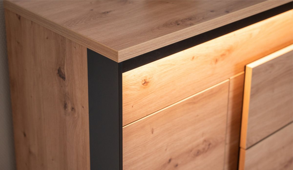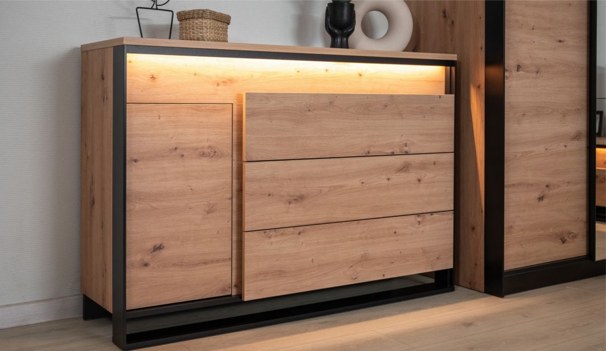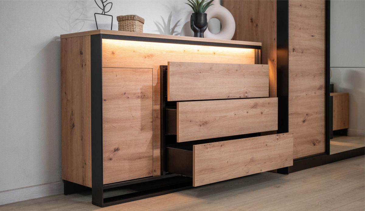 Для производства комода используются плиты Kronospan австрийского происхождения, соответствующие высоким европейским экологическим стандартам (класс эмиссии E0.5). Это гарантирует безопасность для здоровья всех членов семьи, включая детей и аллергиков.