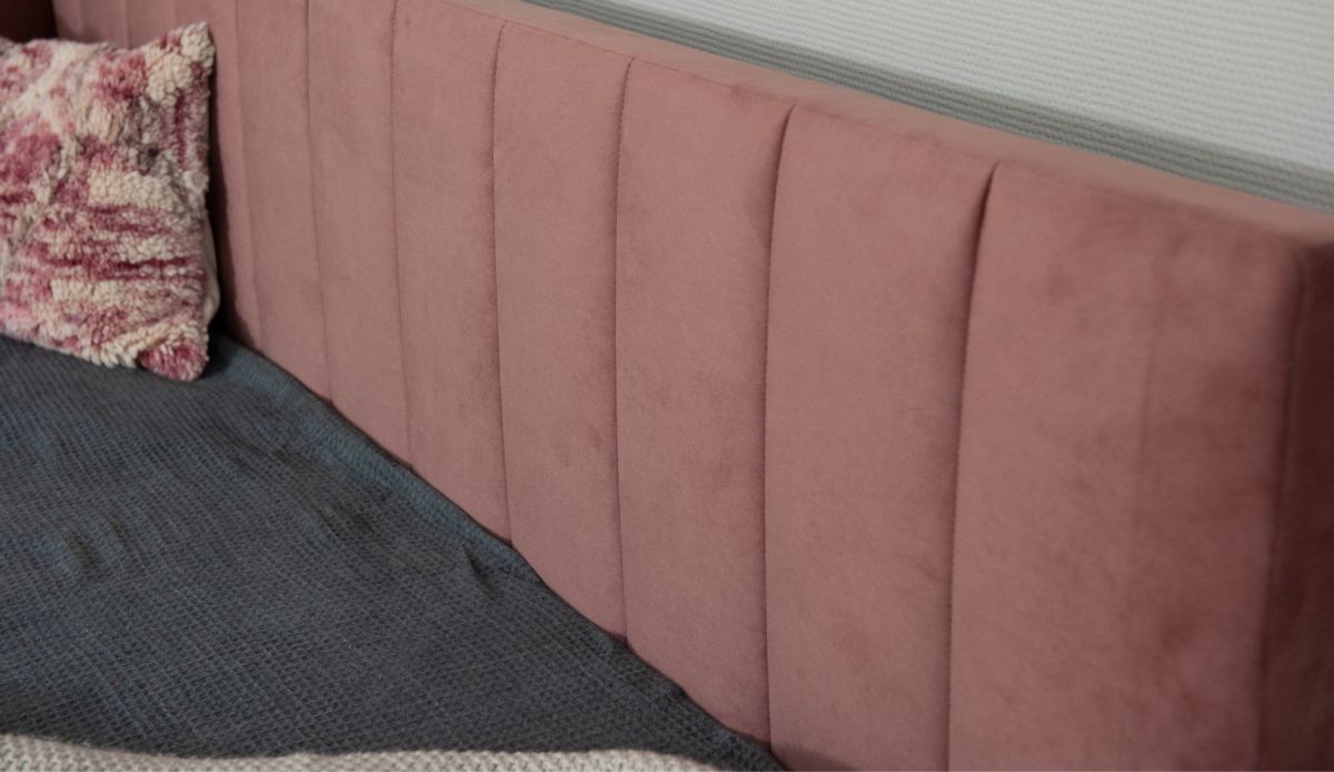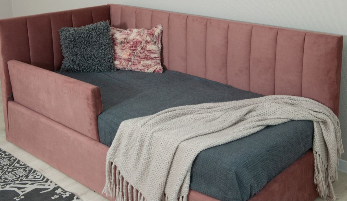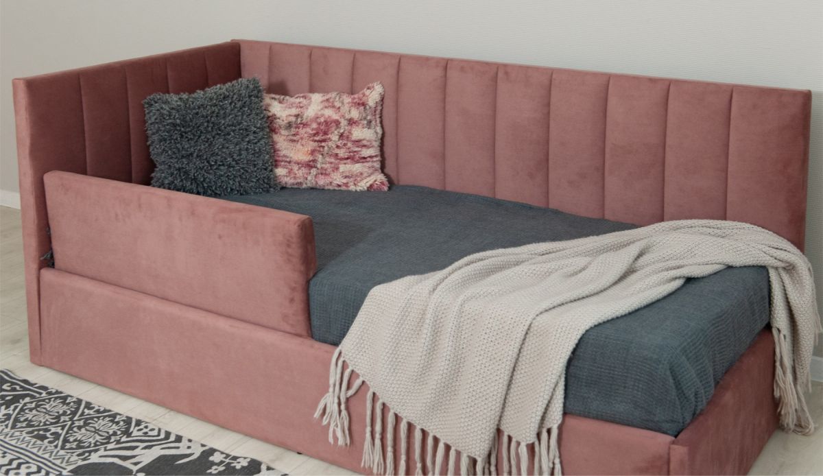 В детскую или подростковую комнату отлично впишется мягкая кровать в минималистичном стиле. Вертикальная прострочка с углублениями по периметру спинки и изголовья подчёркивает геометричность модели, создавая уютную атмосферу и настраивая на спокойный отдых.