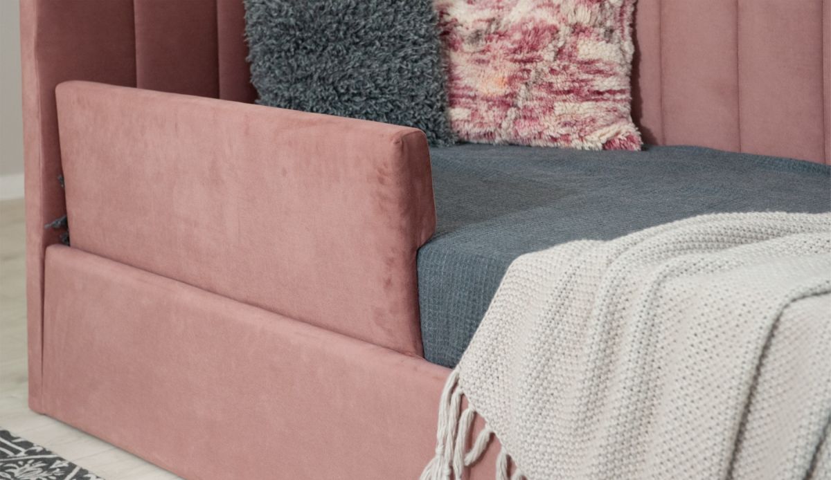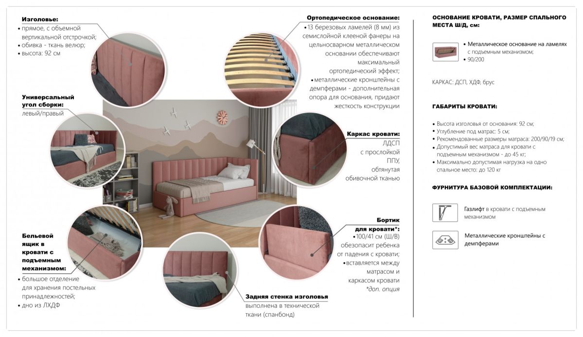 Сглаженные углы, мягкие боковины и корпус кровати гармонично дополняют пространство и исключают возможность получения травм. Спальное место на ортопедических ламелях, установленных на цельносварном металлическом основании, легко откидывается благодаря подъёмному механизму, предоставляя доступ к бельевому ящику.