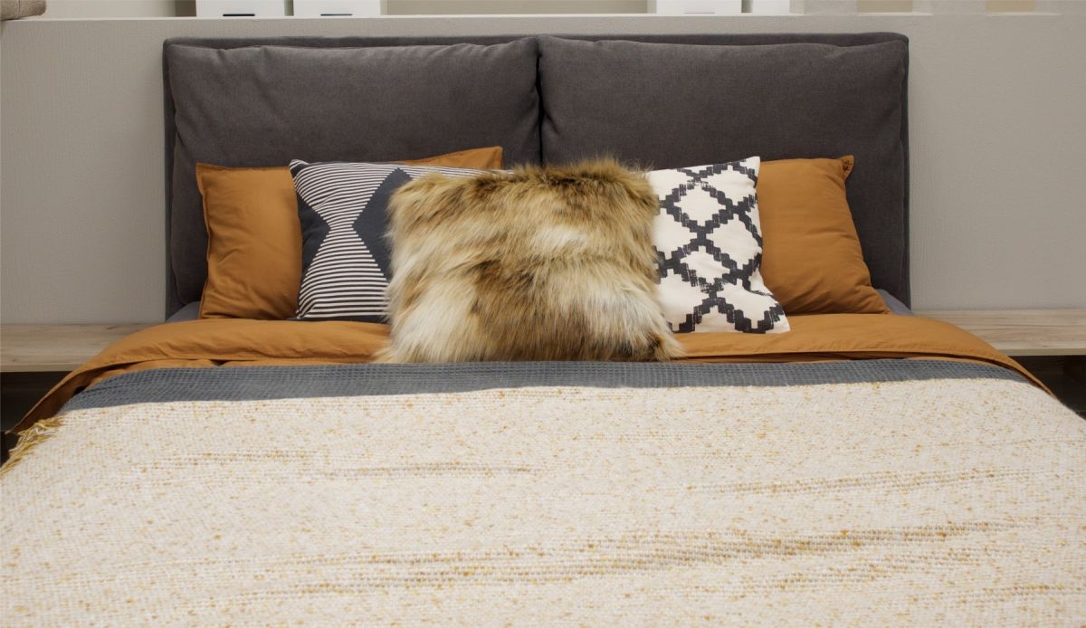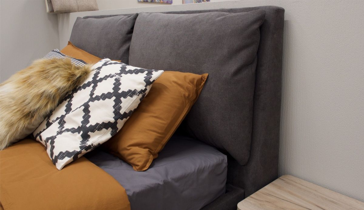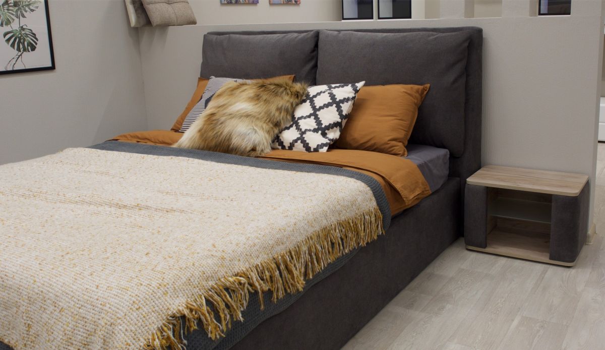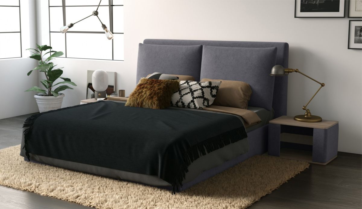 Велюровая ткань с меланжевым эффектом создает благородную игру оттенков, подчеркивая элегантность и индивидуальность кровати.