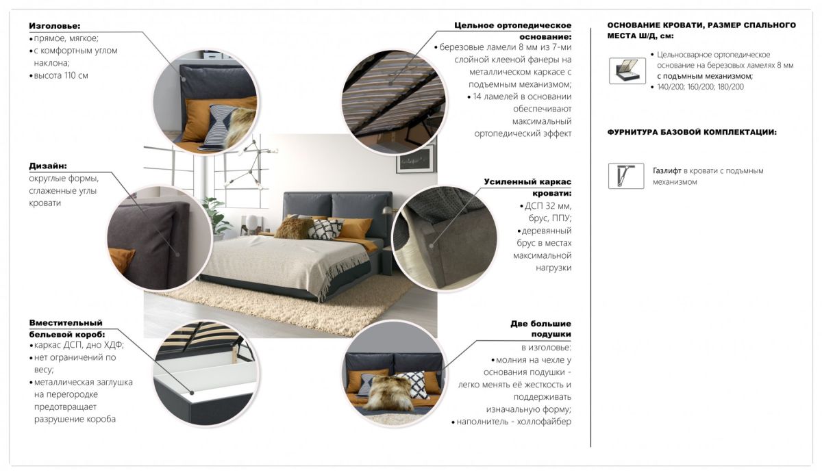 Каркас с толщиной боковых стенок 32 мм усилен деревянным брусом в зонах повышенной нагрузки. Все детали обтянуты мягкой обивкой, что гарантирует долговечность.