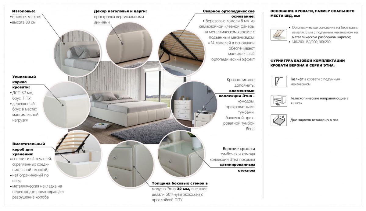 Интерьерная кровать Верона подойдет любителям минимализма и ценителям простых форм, легко впишется в любой интерьер и станет украшением вашей спальни. Невысокое мягкое изголовье украшено декоративной прострочкой в виде прямоугольников, боковины и изножье кровати – вертикальной прострочкой. Надежный подъемный механизм позволит с легкостью убирать постельные принадлежности в объемный бельевой короб. Металлический каркас с ортопедическими ламелями гарантирует максимальное удобство во время сна. «Верона» станет акцентом спальни, залогом хорошей релаксации и отличного настроения по утрам.