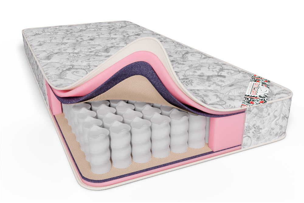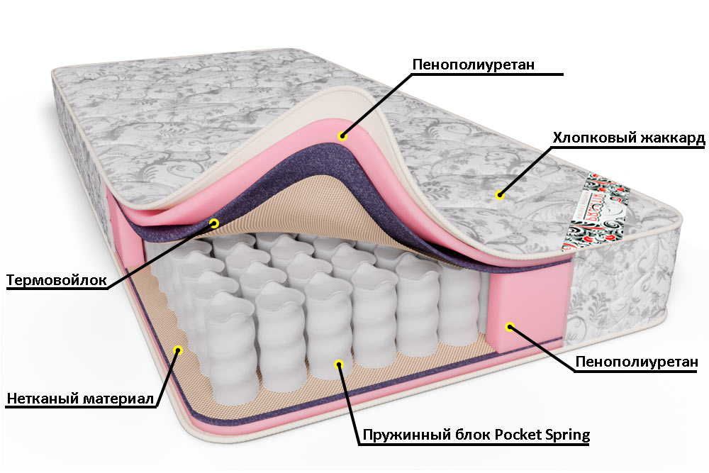 После пружинного блока идёт слой термовойлока особой плотности, а затем пенополиуретан толщиной 15 миллиметров. Матрас усилен коробом из пенополиуретана, который имеет толщину 40 миллиметров.