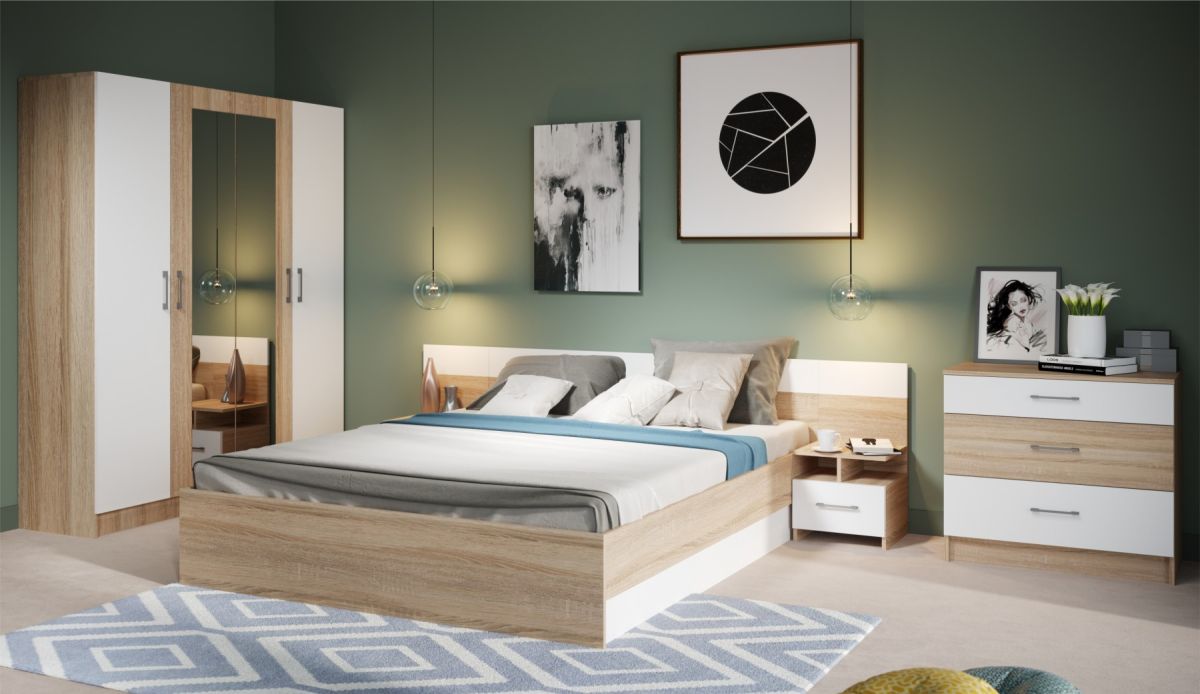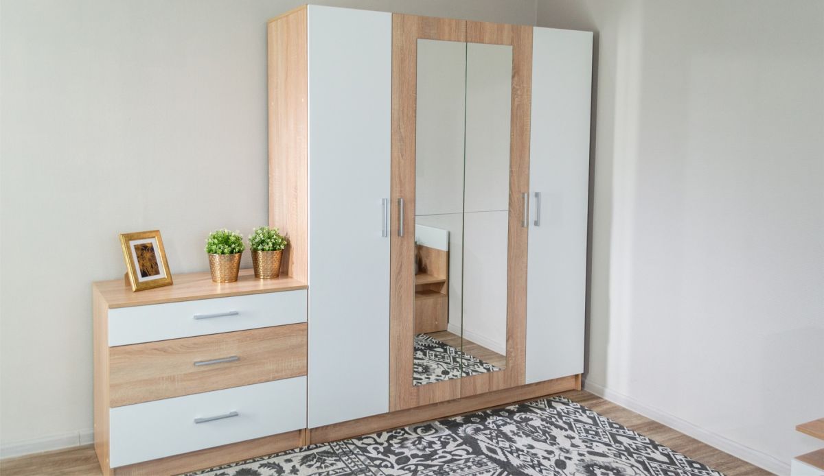 Классический распашной четырехдверный шкаф Алена выполнен в скандинавском стиле. Минимализм строгих линий сочетается с теплыми оттенками дуба сономы. Вставки белого цвета на фасадах придают легкость конструкции и зрительно увеличивают внутреннее пространство комнаты. Зеркала на фасадах добавляют света в комнату. Легко впишется в обстановку любой комнаты, а его вместимость Вас приятно удивит. Идеально компонуется с комплектом спальни Алена.
