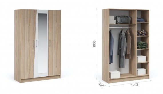 Вместительный распашной трехдверный шкаф Антария из ЛДСП с асимметричными скошенными линиями фасадов вносит свободу и движение в жилое пространство, делает интерьер более сложным и необычным. Нейтральные цвета декора универсальны для любого стиля интерьера, а зеркало на фасаде визуально добавляет свет. Продольная металлическая штанга удобна для хранения длинных вещей, а полки для сложенной одежды и коробок с обувью.