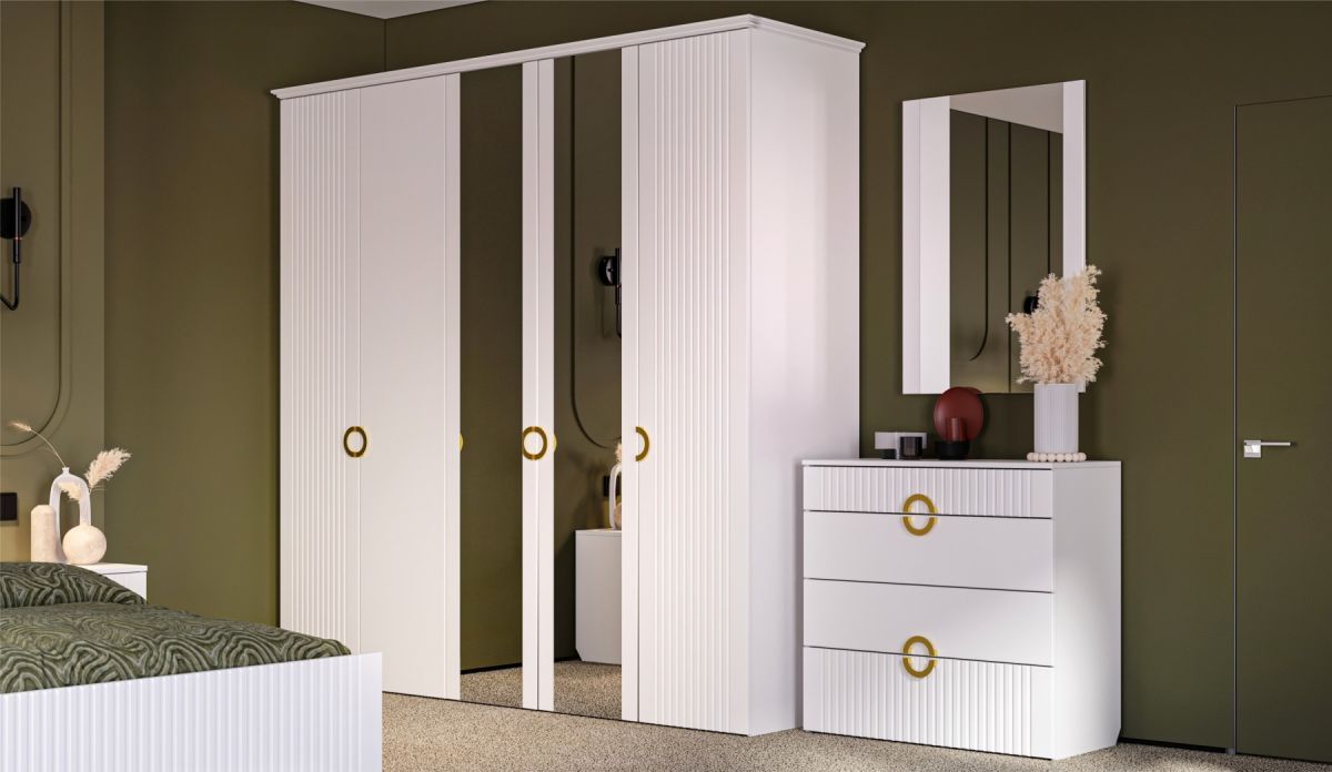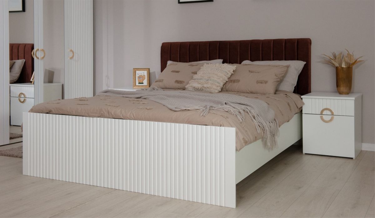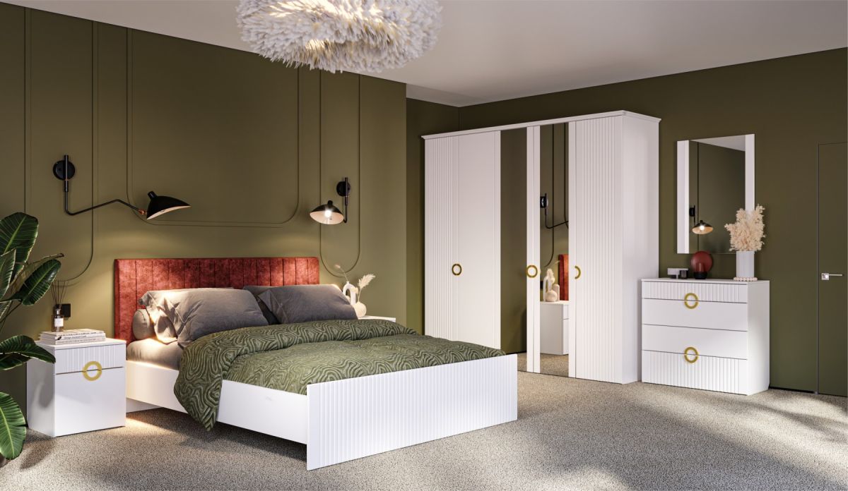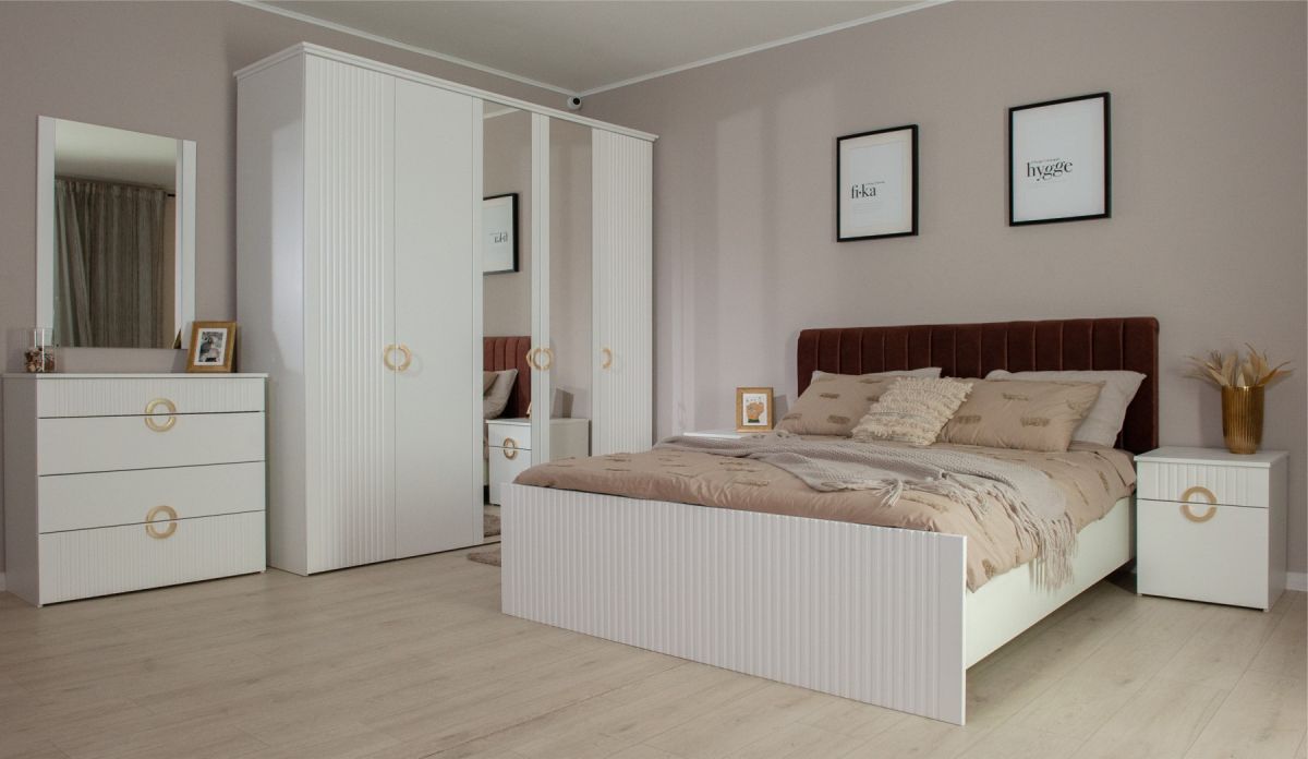 Трендовая новинка спальня Миа с матовым лакокрасочным покрытием и вертикальной фрезеровкой выглядит благородно, делает интерьер спокойным и изысканным. Дизайнерские ручки из металла золотого цвета добавляют шарма, подчеркивают индивидуальность. Элегантная кровать со стеганым изголовьем с выраженным объемным рельефом не только яркий декоративный акцент, но и комфортное место для здорового сна или отдыха с книгой.