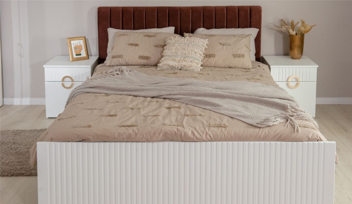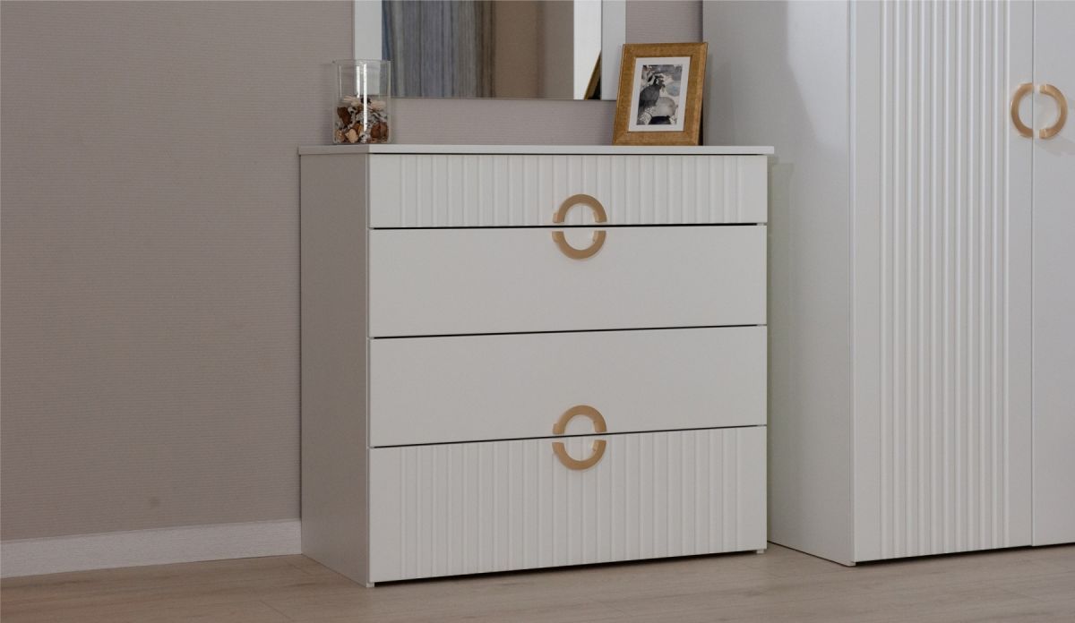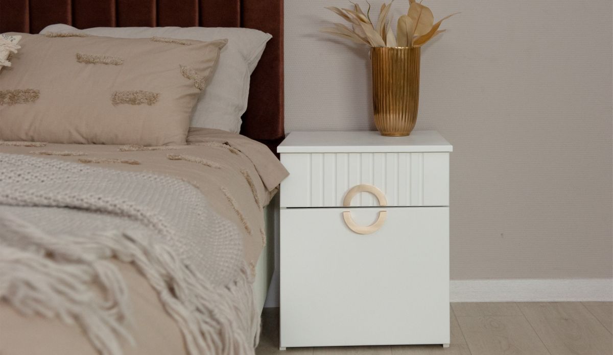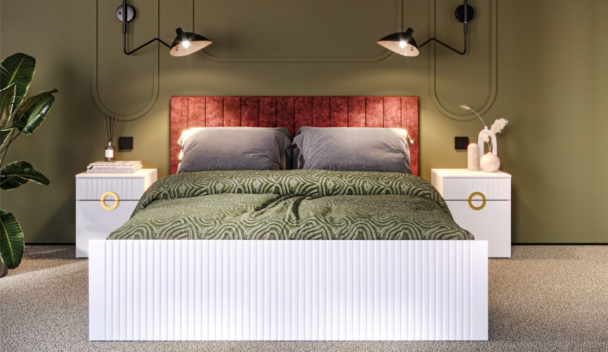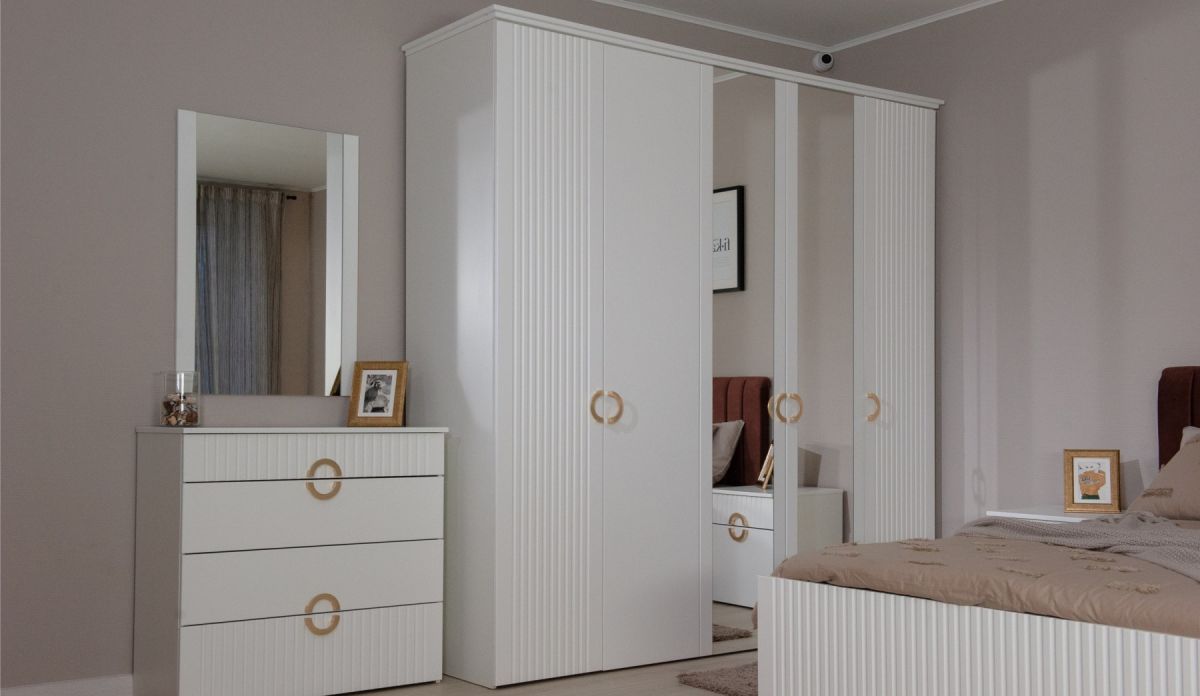 Трендовая новинка спальня Миа с матовым лакокрасочным покрытием и вертикальной фрезеровкой выглядит благородно, делает интерьер спокойным и изысканным. Дизайнерские ручки из металла золотого цвета добавляют шарма, подчеркивают индивидуальность. Элегантная кровать со стеганым изголовьем с выраженным объемным рельефом не только яркий декоративный акцент, но и комфортное место для здорового сна или отдыха с книгой.