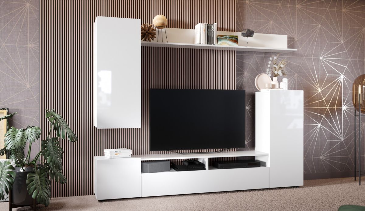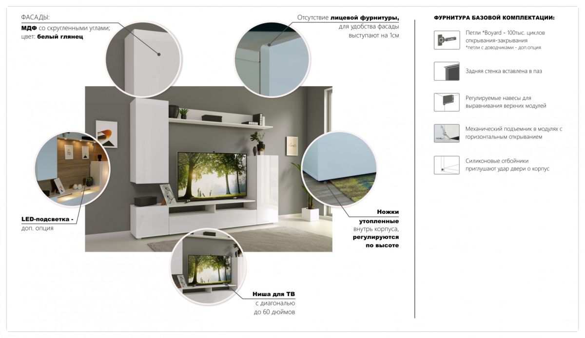 Стенка «Лия» — это идеальное сочетание современного европейского дизайна и практичности. Ее лаконичные формы, белый глянец и скругленные фасады из МДФ создают стильный акцент в интерьере, а функциональные элементы делают ее удобной для повседневного использования.