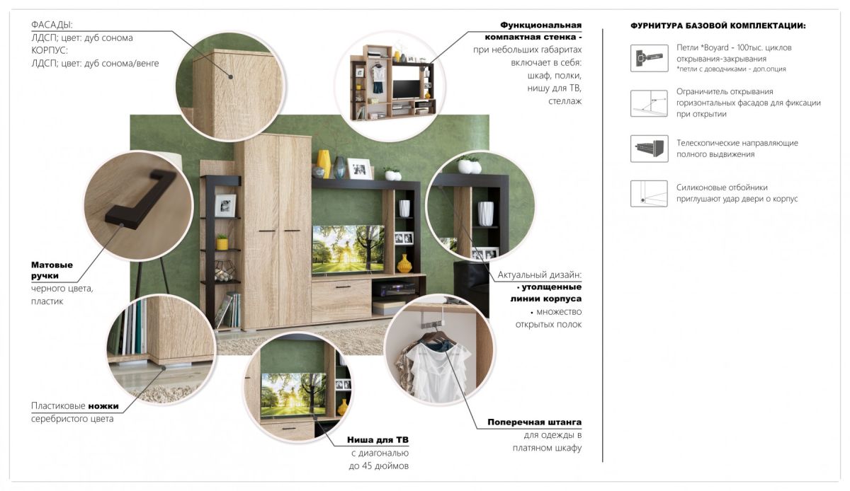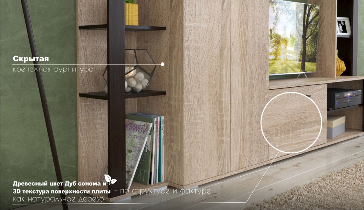 Гостиная Торонто - оригинальный дизайн, вместительность и небольшие габариты. Занимая мало места по глубине и ширине, она включает в себя платяной шкаф с штангой, нишу под ТВ и множество полок для приставок, колонок, книг и декора. Использование популярных цветов Дуб сонома и венге даёт возможность легко сочетать эту стенку в гостиной с другими предметами мебели – столами, журнальными столиками, стеллажами или комодами. Выполнена из экологичных материалов.