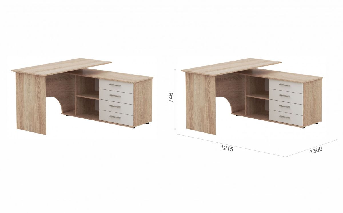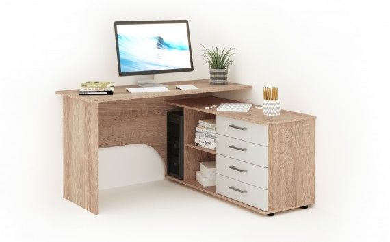На широкой столешнице легко поместятся монитор, клавиатура и документы. А на угловой части можно разместить оргтехнику. В столе предусмотрено место для системного блока и письменных принадлежностей. Вы можете дополнить стол надставкой с множеством полок для папок, книг и декора.