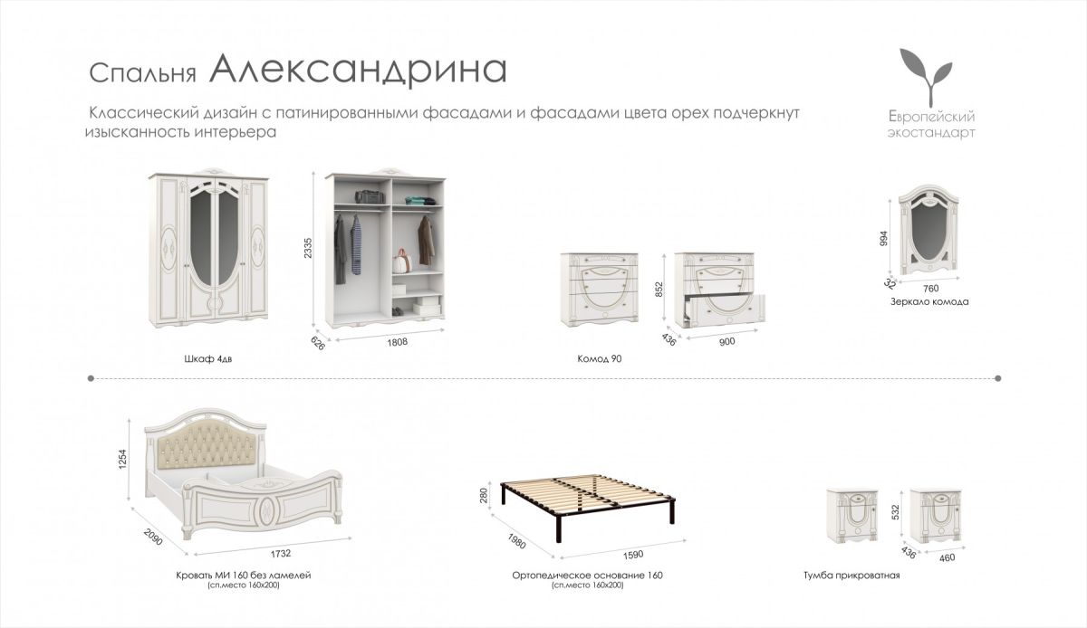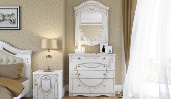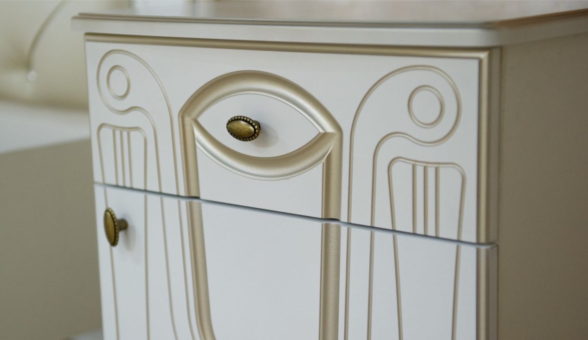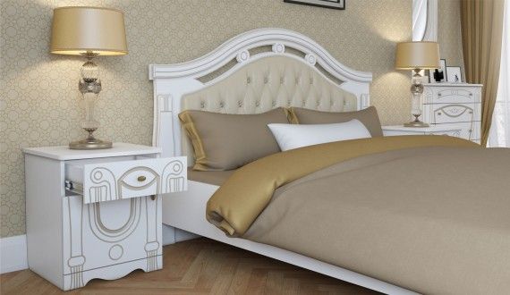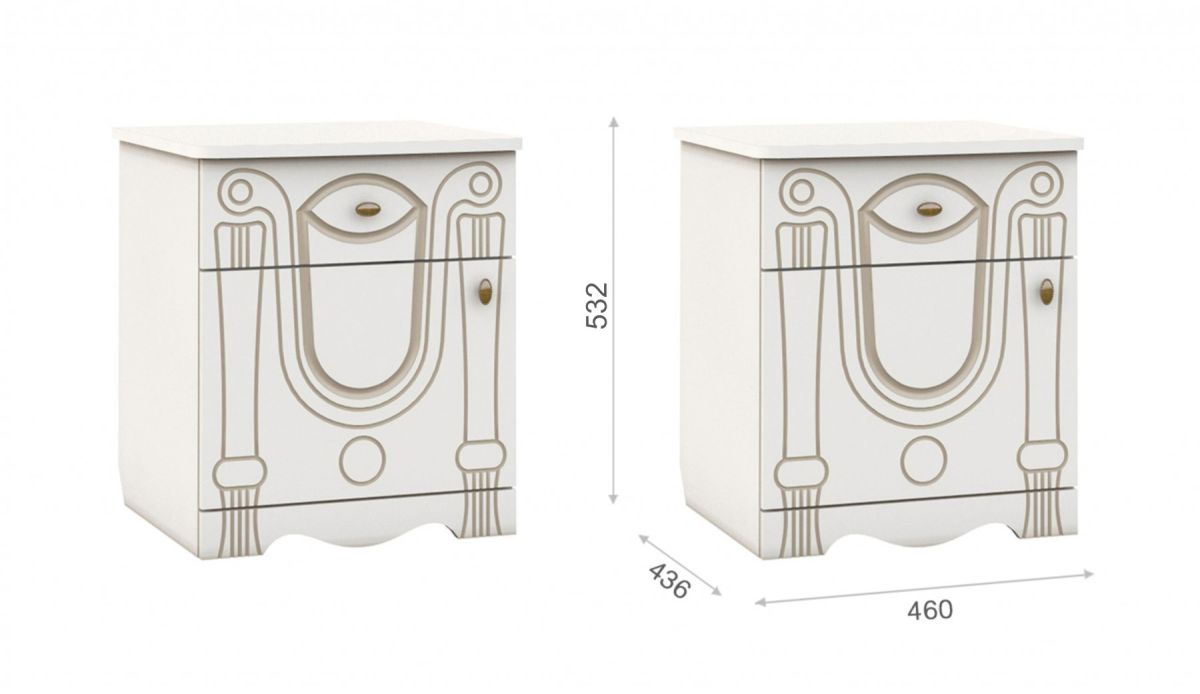Прикроватные тумбы выполнены в итальянском стиле - олицетворение гармонии, сочетание роскоши и величия, спокойствия и уюта. Крашеные фасады из МДФ декорированы мотивом классической архитектуры «Античная лира» и изображением колонн по краям модуля. Прикроватные тумбы с ящиками на телескопических направляющих поместят в себя все вещи, которые важно иметь под рукой - телефон, светильник или любимая книга. Идеально дополняют кровать Александрина.