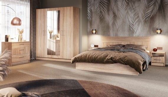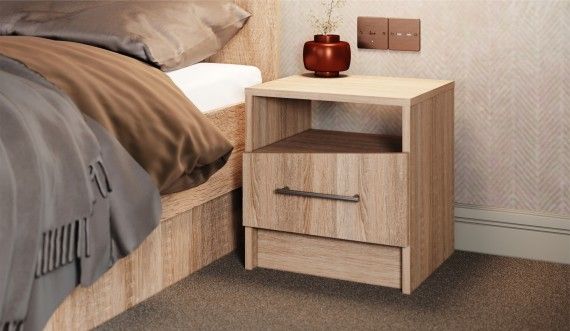 Прикроватные тумбы из ЛДСП с асимметричными скошенными линиями фасадов вносят свободу и движение в жилое пространство, делают интерьер более сложным и необычным. Нейтральные цвета декора универсальны для любого стиля интерьера. Прикроватные тумбы с ящиком на роликовых направляющих поместят в себя все вещи, которые важно иметь под рукой - телефон, любимая книга, стакан воды.