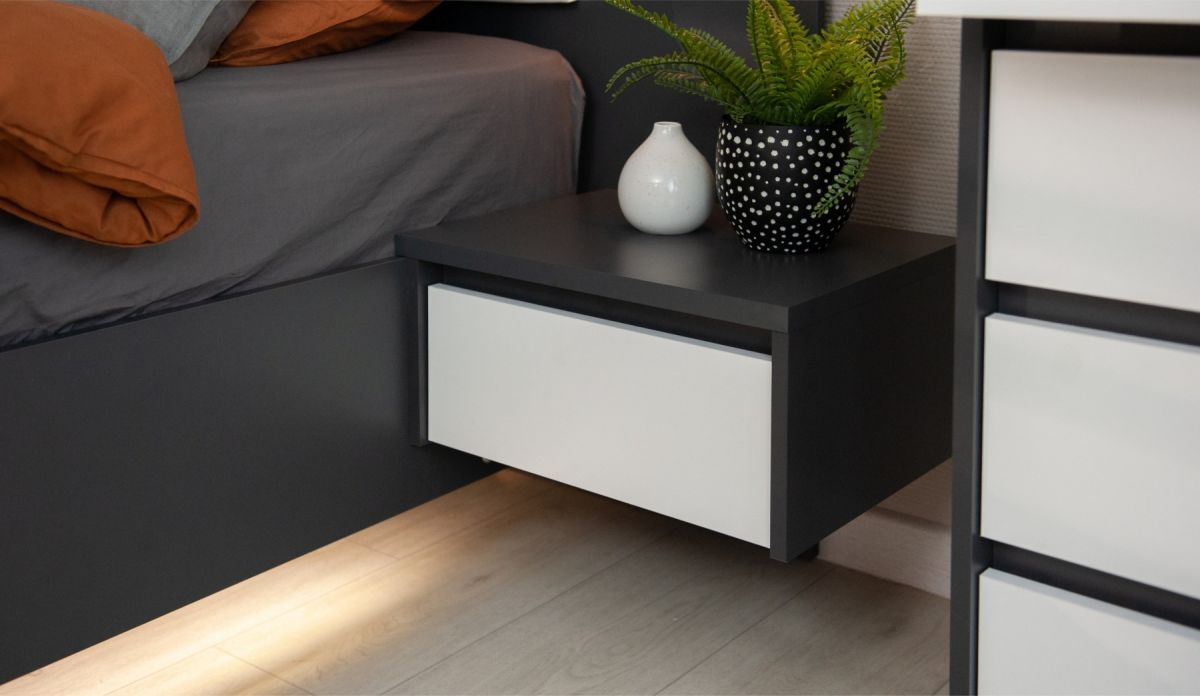 Современная прикроватная тумба Мишель с креплением к кровати создает визуальную целостность и «иллюзию парения». На столешнице поместятся небольшой светильник и необходимые аксессуары, а в ящике с направляющими полного выдвижения удобно хранить личные вещи. Идеально компонуются со всеми модулями системы Мишель.