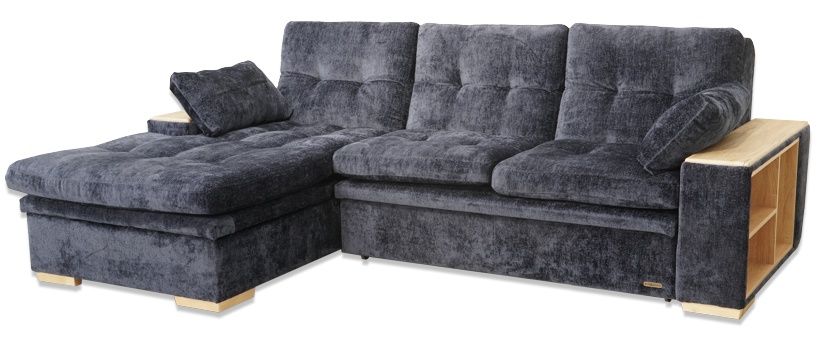 Удобный диван, комфортное спальное место. В подлокотнике со стороны дивана встроенные полочки, со стороны оттоманки —без полок. Большой ящик внутри